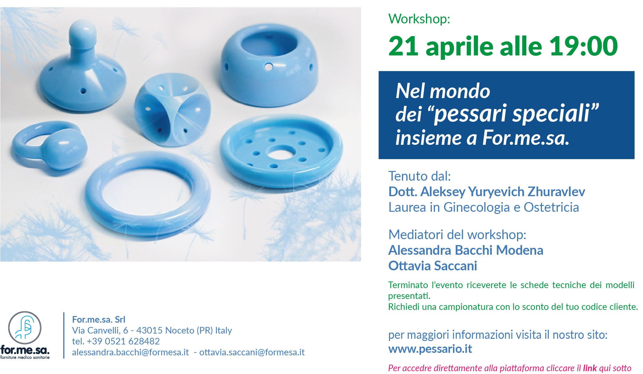 Un workshop dedicato all’approfondimento dei cosiddetti “pessari speciali”, modelli meno comuni ma fondamentali per rispondere a esigenze cliniche specifiche. Un’occasione unica per esplorare l’intera gamma For.me.sa., comprenderne le peculiarità, e aggiornarsi sulle novità in ambito di prolasso e incontinenza.
